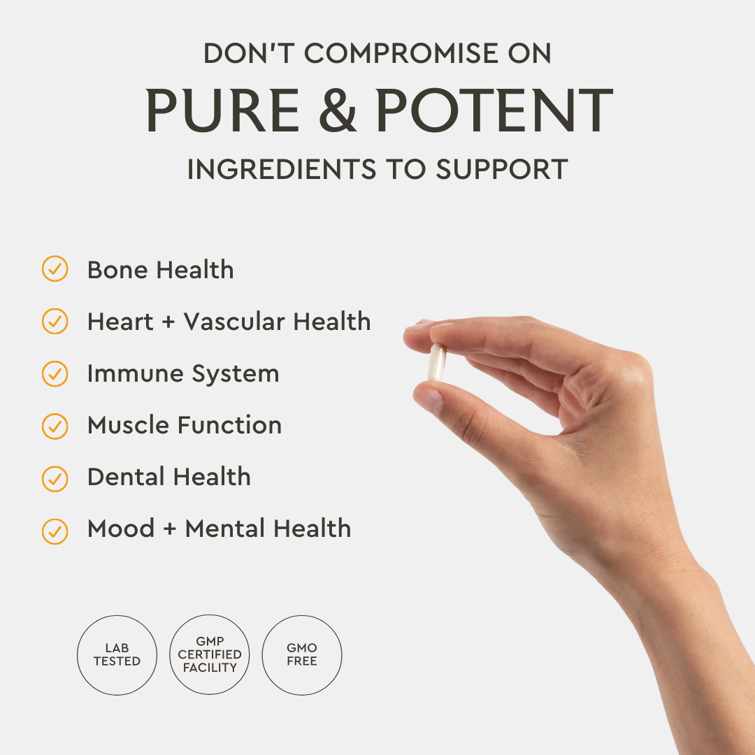 This little capsule is a powerhouse, packed with 5,000IU of D3, 15mcg of K2, and 50mcg of K to give your daily health routine a big boost. We've focused on both potency and convenience—each single vegetarian capsule delivers a substantial yet carefully measured amount of D3, K2, and K. This precise formulation ensures that you receive an effective dosage in just a single serving, making it a straightforward addition to your daily health regimen.