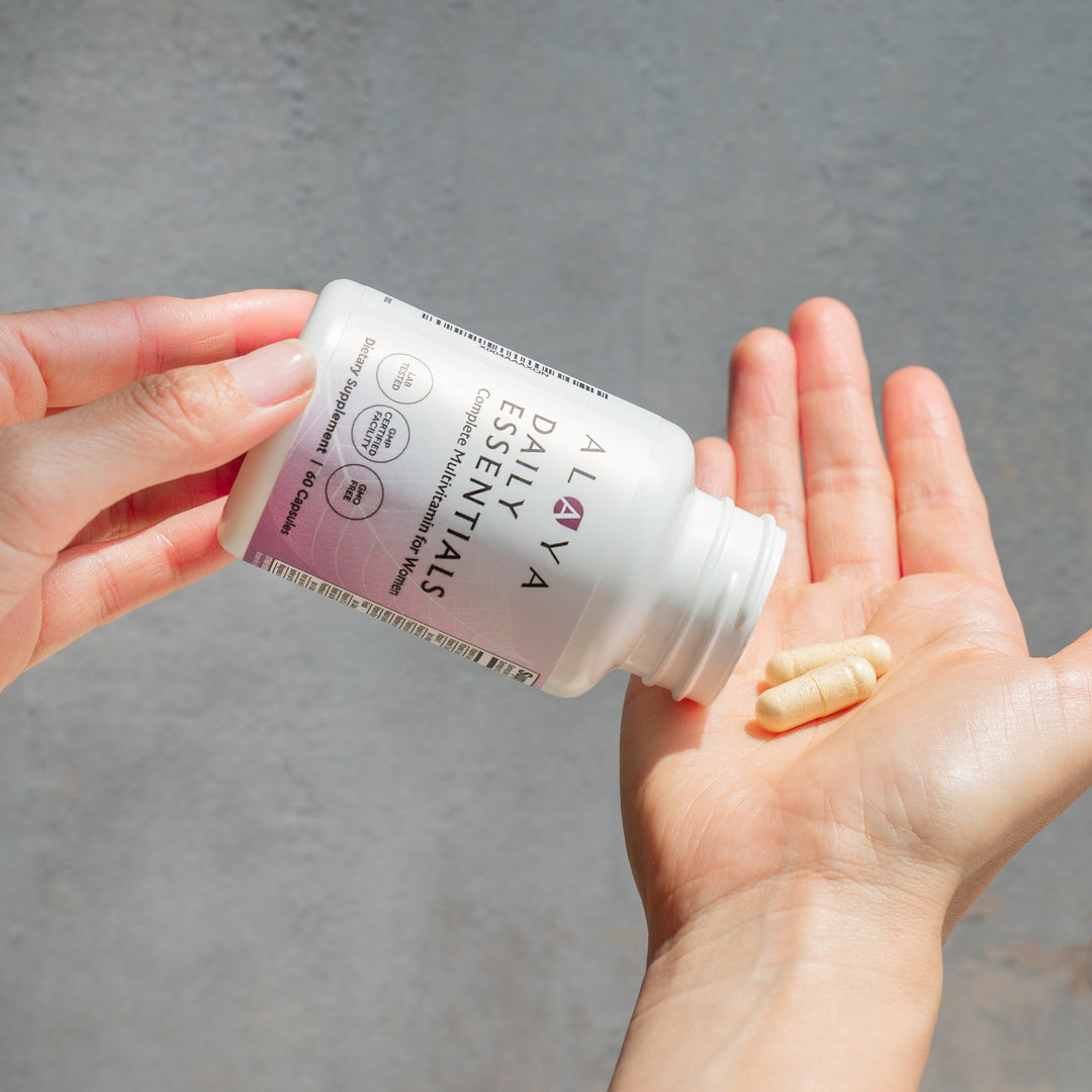 Alaya Daily Essentials supplement bottle on a clear background #hide