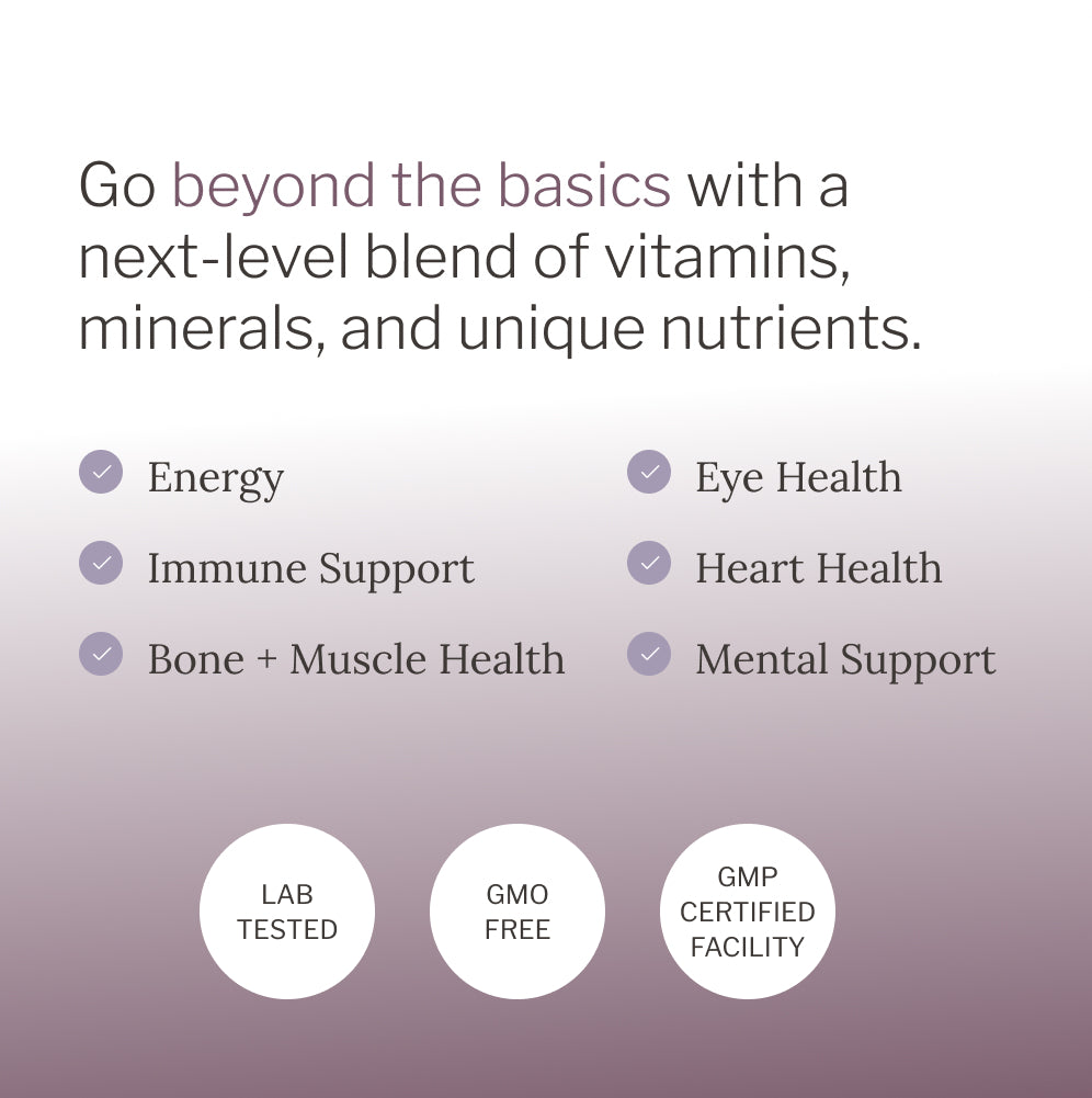 A comprehensive, daily multivitamin made with bioavailable forms of key nutrients to support energy, immune function, bone health, and overall well-being.