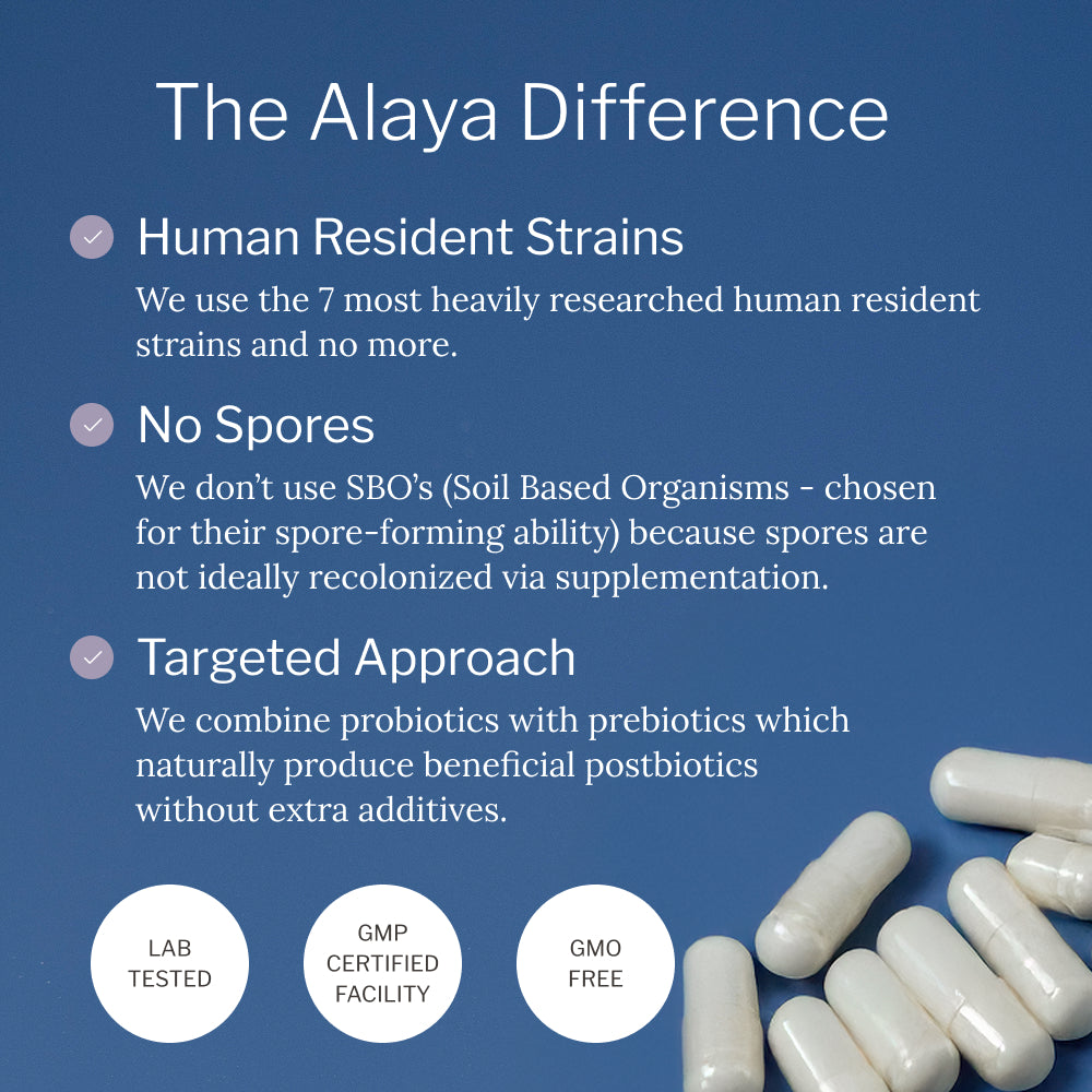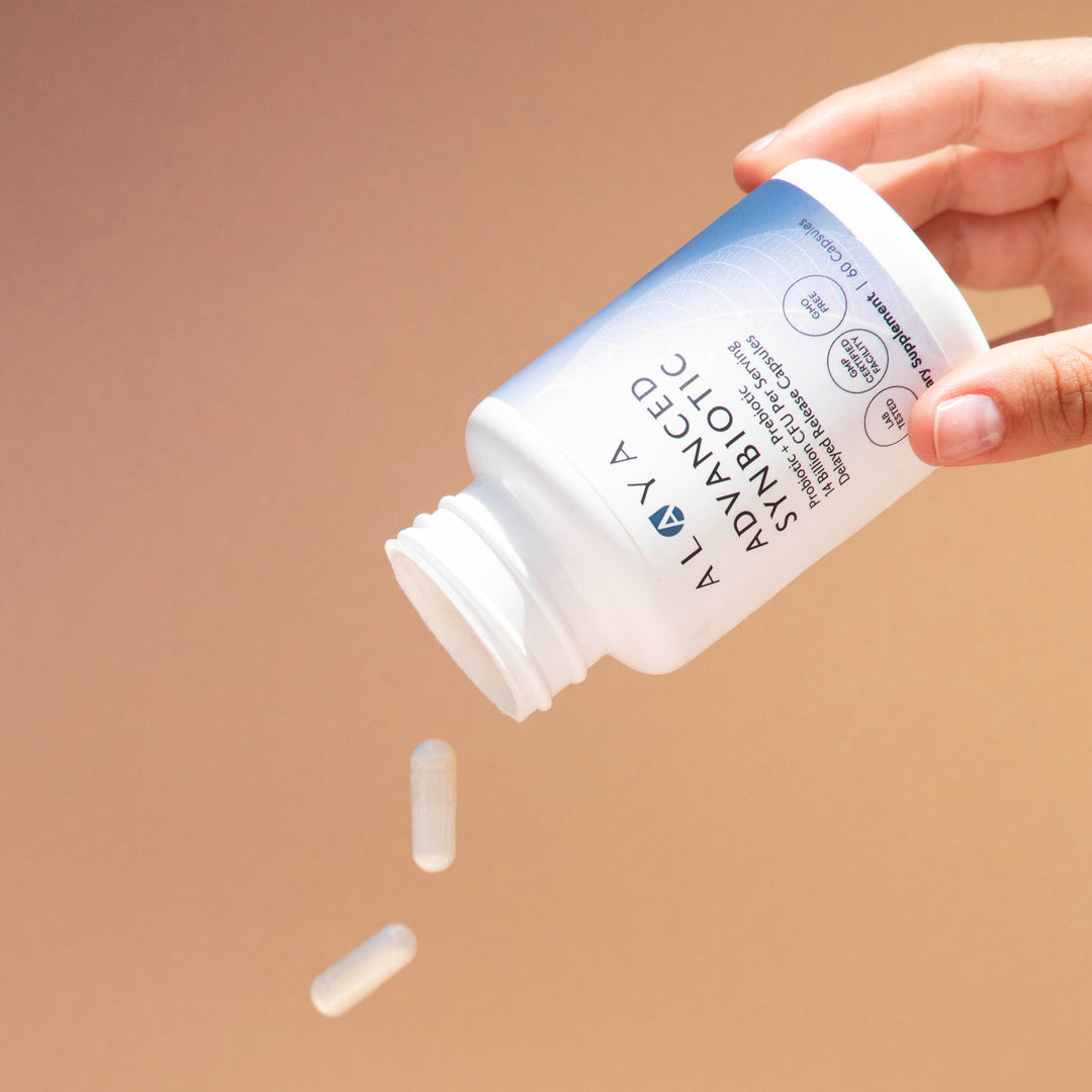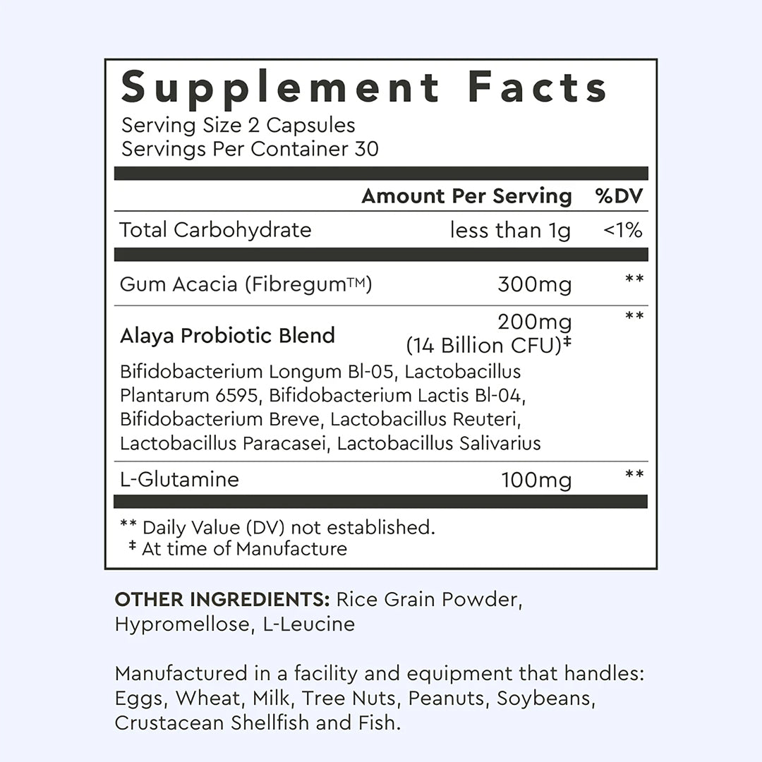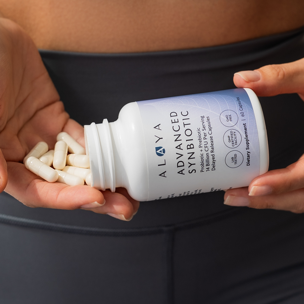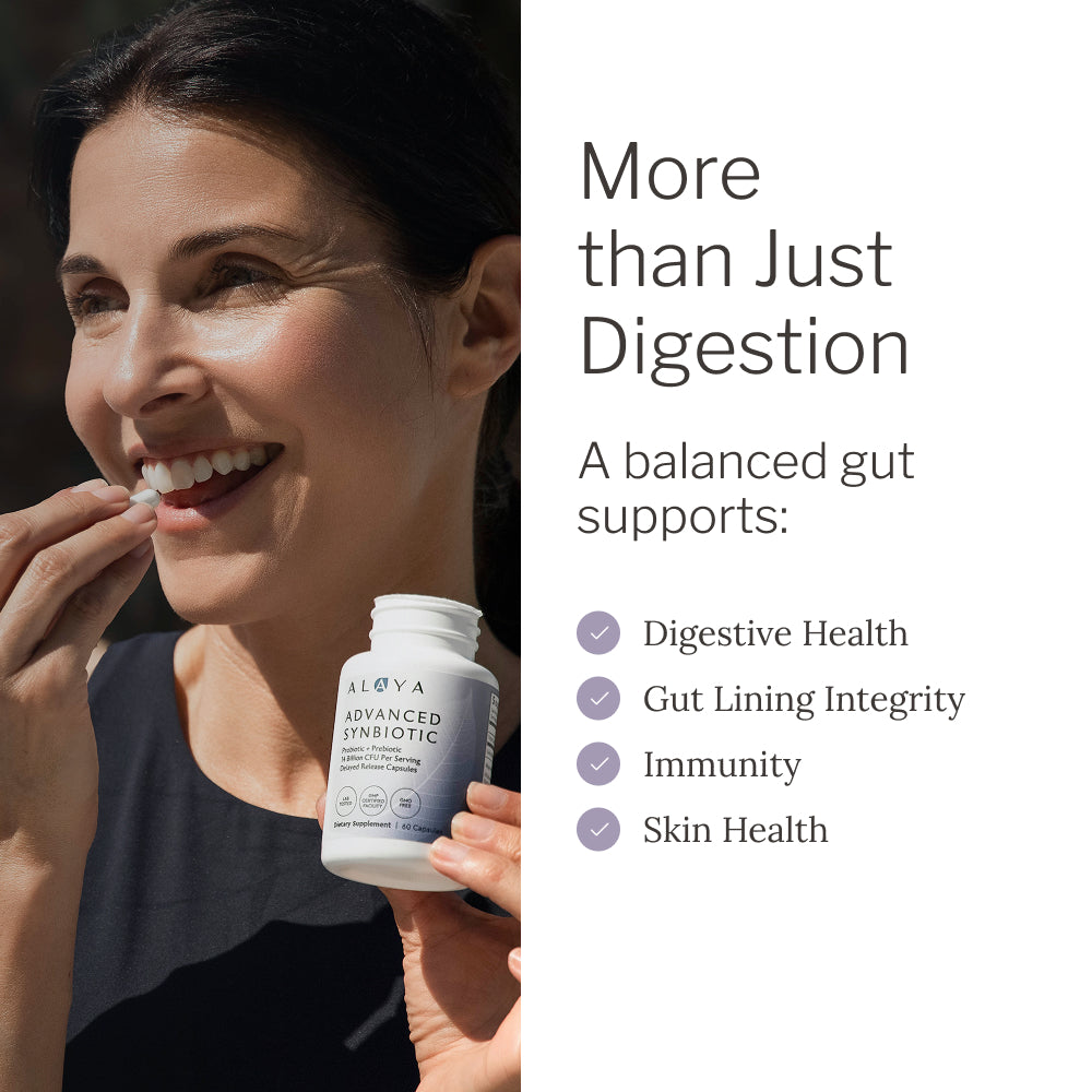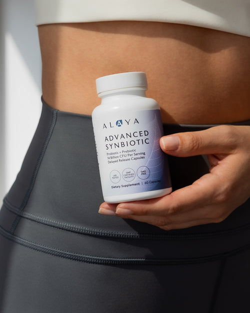 Alaya Naturals Advanced Synbiotic combines prebiotics, probiotics, and L-Glutamine in one targeted formula to help maintain microbial balance and everyday gut comfort.*