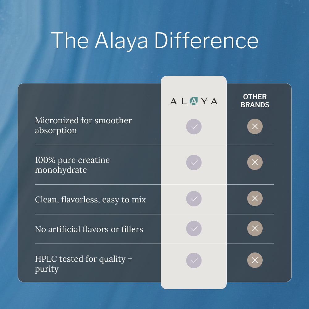 As we age, our natural creatine stores decline, leading to slower recovery, reduced strength, and less energy during daily activity. Alaya Creatine helps support those levels with a pure, micronized form that supports both body and mind.