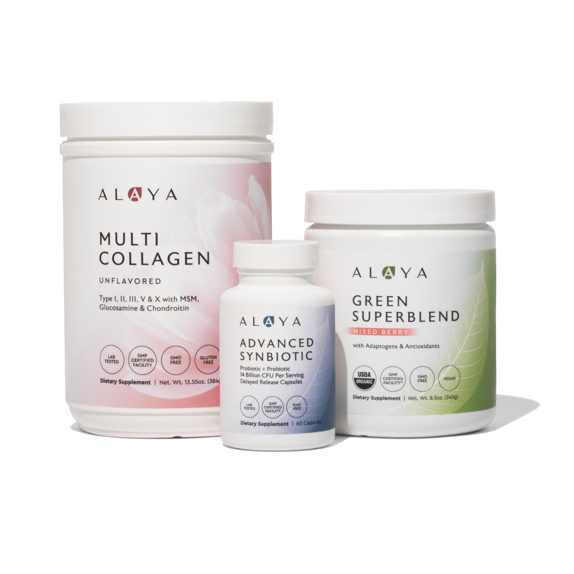 Alaya Multi Collagen, Advanced Synbiotic and Green Superblend supplement containers on a white background