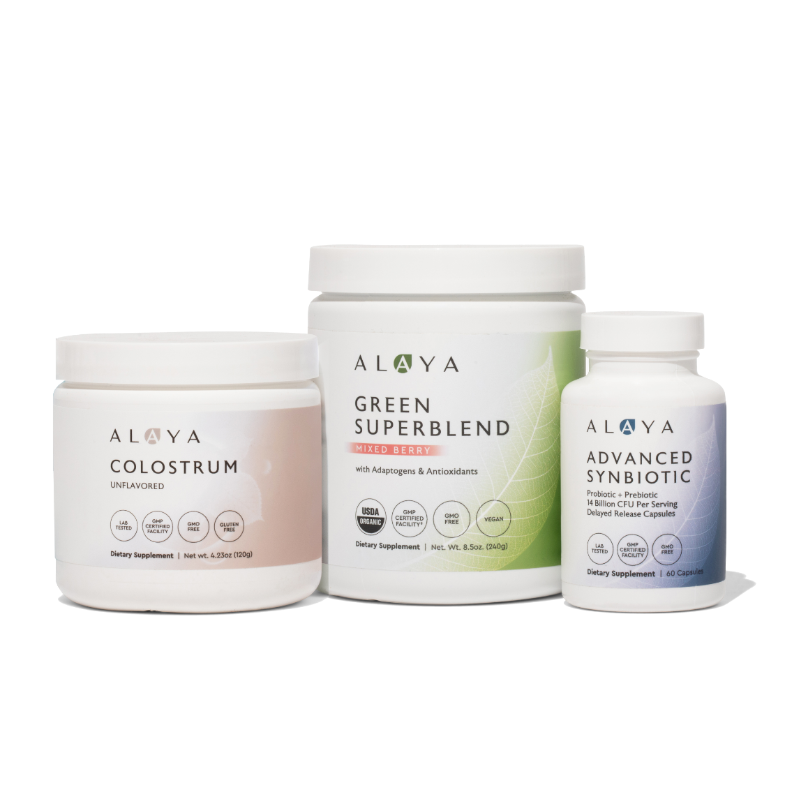 Each product plays a distinct role. Colostrum provides naturally occurring bioactive compounds designed to support gut lining integrity. Advanced Synbiotic delivers human-resident probiotic strains with prebiotic fiber to support microbial balance. Organic Green Superblend supports the body’s natural detox pathways, antioxidant defenses, and stress-response systems with a blend of greens, antioxidants, and adaptogens.