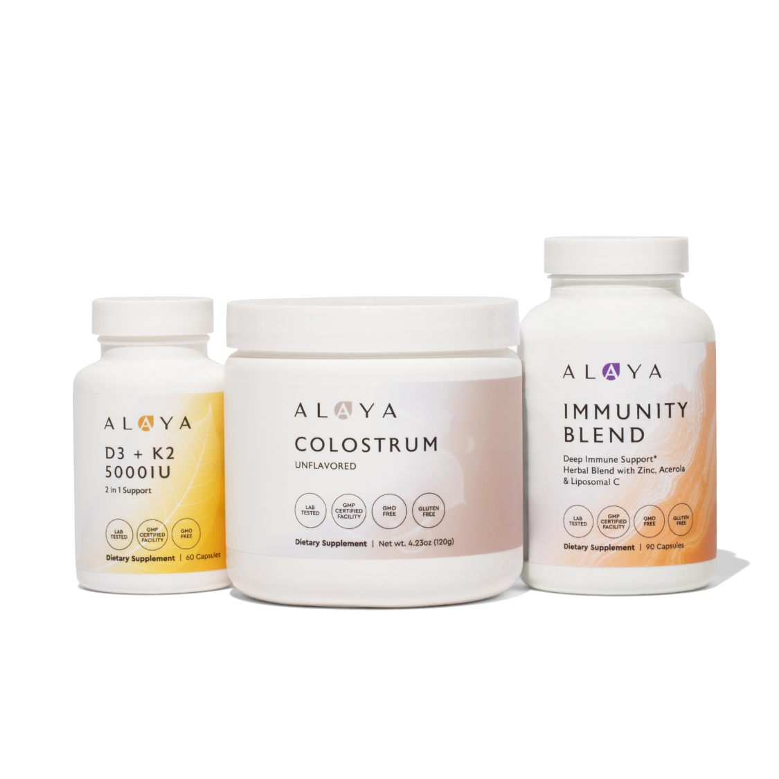 Each product plays a distinct role. Colostrum supports immune communication through the gut using naturally occurring bioactive compounds. Immunity Blend provides targeted nutrients and botanicals to support immune pathways during periods of increased demand. Vitamin D3K2 supports immune nutrient sufficiency, helping maintain the baseline vitamin levels the immune system relies on for daily function.*