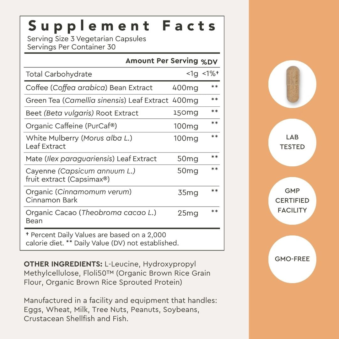 Each capsule combines targeted botanicals and antioxidants designed to help support steady energy and metabolic efficiency throughout the day.